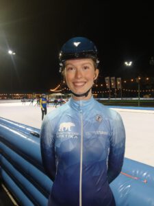 Hoi, ik ben Demi Meinten, ik ben student International Relations and Organisations aan de Universiteit Leiden en ik kom uit Nijkerk. Mijn eerste meters op de schaats heb ik gemaakt op het slootje achter het huis van mijn opa en oma en ben sindsdien elke winter weer op het ijs te vinden. Ik ben, zoals de meesten denk ik, begonnen met langebaanschaatsen en heb daarnaast ook nog een aantal jaar geshorttrackt voordat ik uiteindelijk de overstap maakte naar de marathon. Ik ben begonnen met de baancompetitie in Utrecht en ben daarna doorgestroomd naar de 6-banen competitie. In het seizoen van 2023/2024 heb ik als eenling de overstap gemaakt naar het beloftenpeloton en aankomend seizoen zal ik van start gaan in de kleuren van Arktika.